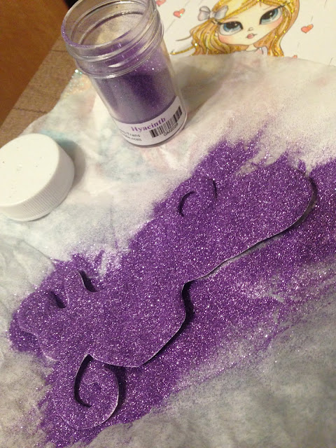 The rest of the layout came together quite quickly!  After printing off the gorgeously pre-colored Digital Stamp image, I added my glitter to her hair, hearts and umbrella using the Nuvo Small Glue Pen. I used Aztec Gold Glitter - G1006, Ballerina Microfine Glitter - GM024