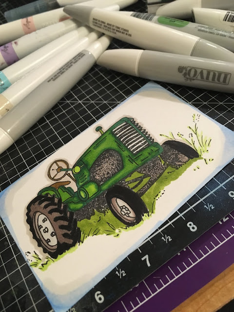 This is a really simple card (not all cards have to be complicated!!!). I started by stamping the main tractor image with a black ink and coloring with my Nuvo Marker Pens.