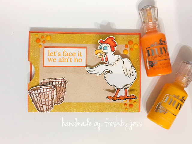 I stamped with background using Brocade Backgrounds Stamp Set. I used Versamark Ink and embossed with Firefly Embossing Powder. SOO pretty! I edged the paper and all my pieces with Lemon Sorbet Embellishment Mousse. The "Hello" sentiment was stamped with Versamark Ink and heat embossed with Nautical Embossing Powder. Nuvo Sunkissed CopperGilding Flakes were added to my patterned paper using the Nuvo Medium Glue Pen. I randomly scribbled on the glue and let it dry. Ones the glue was dried and "tacky", I gently added on the Gilding Flakes. I sprinkled on a bit of Super Thick White Embossing Powder to random spots and heat set from underneath.