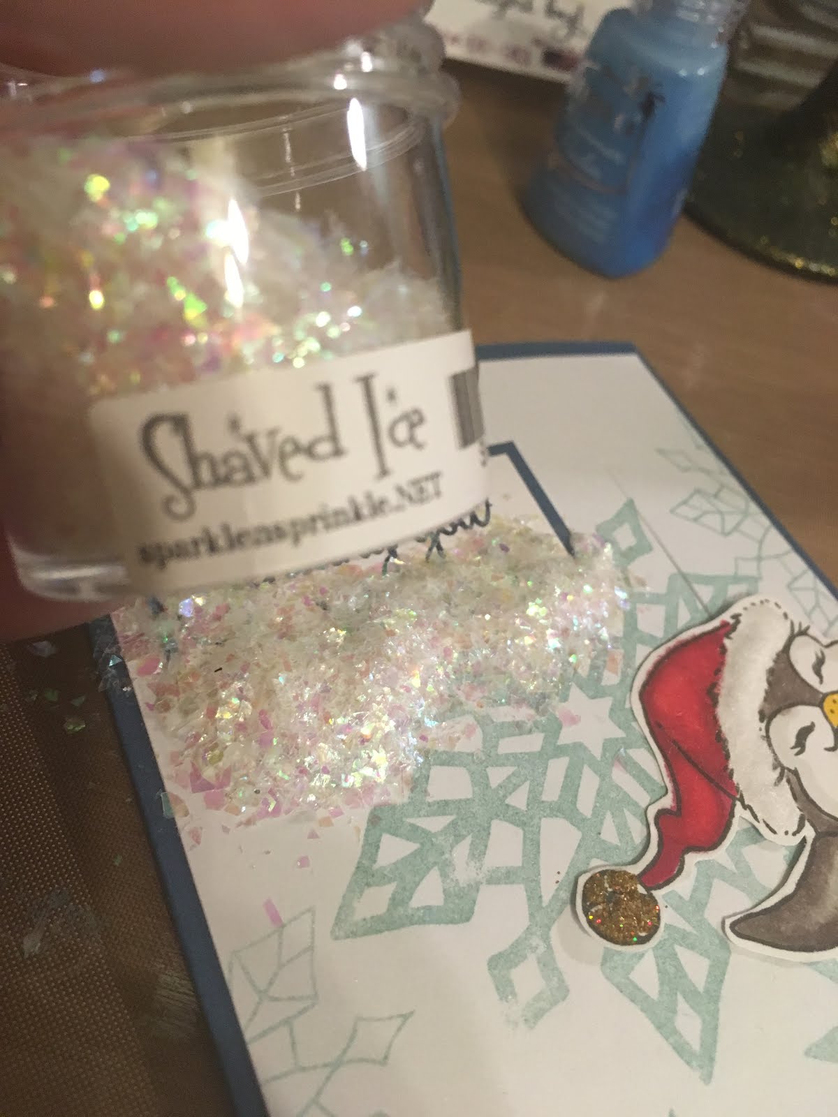 The sentiments were stamped with Veramark Ink and embossed with one of my faves - Nautical Embossing Powder! I matted with a piece of blue carstock and then after attaching to my cardfront, I added some Shaved Ice Glitter with Dimensional Glue (NOTE: Don't try to slide your penguin up before your glue dries - don't ask me how I know! haha).